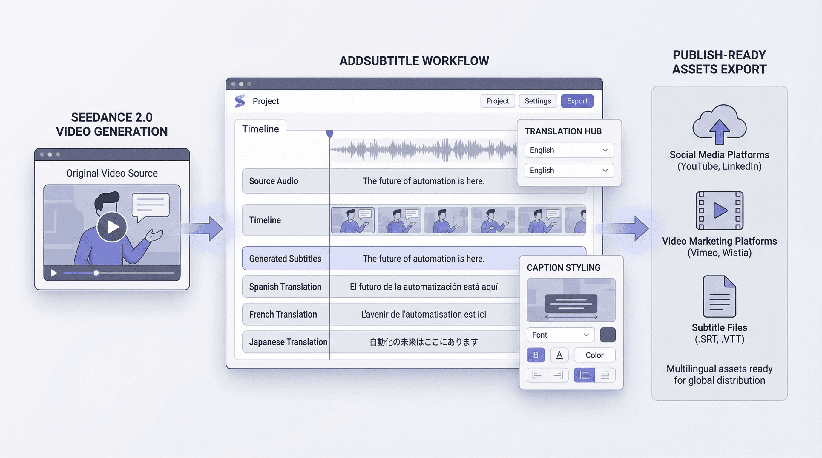 Seedance 2.0 can help create the visual material. Addsubtitle helps make that material understandable and publishable across languages.