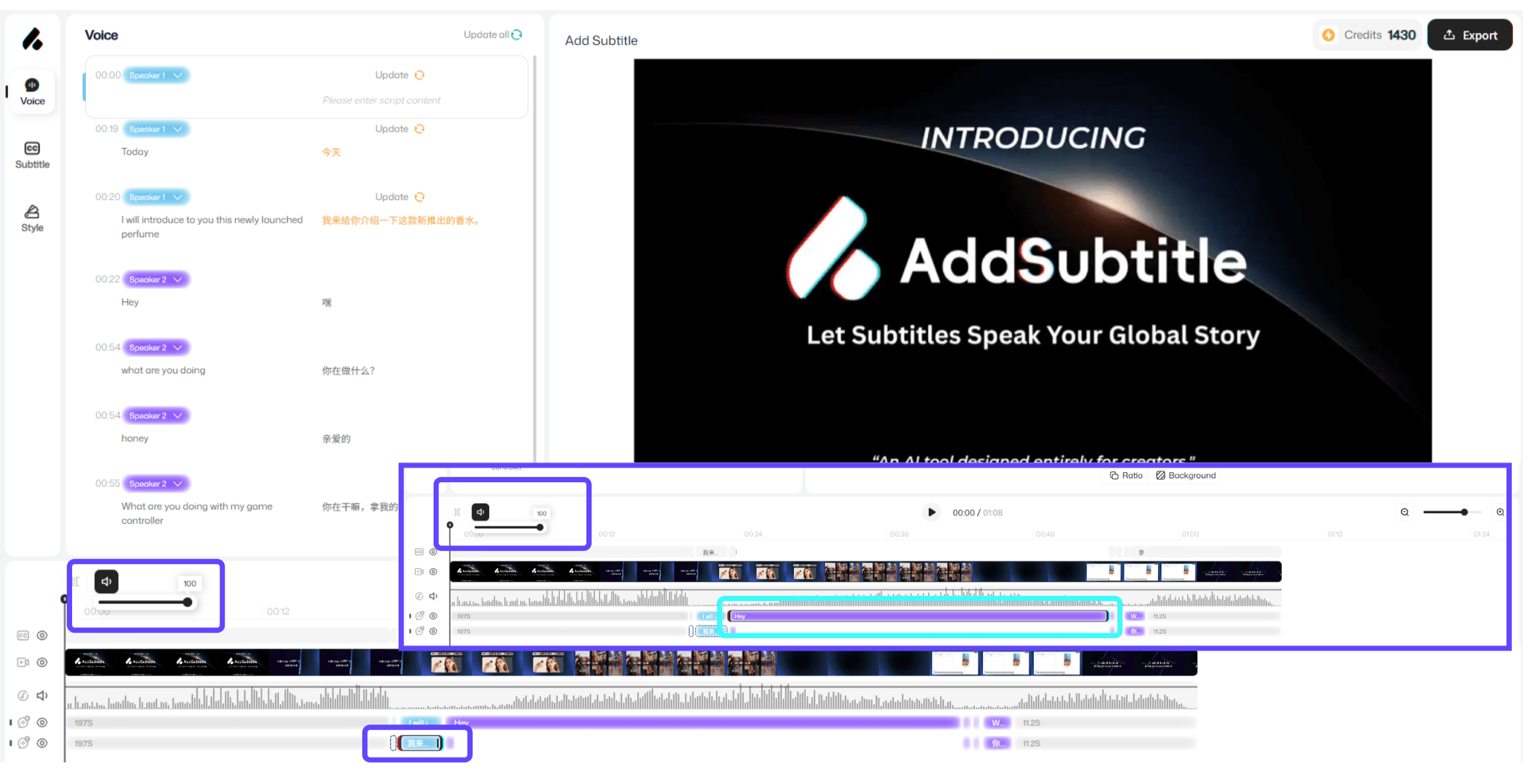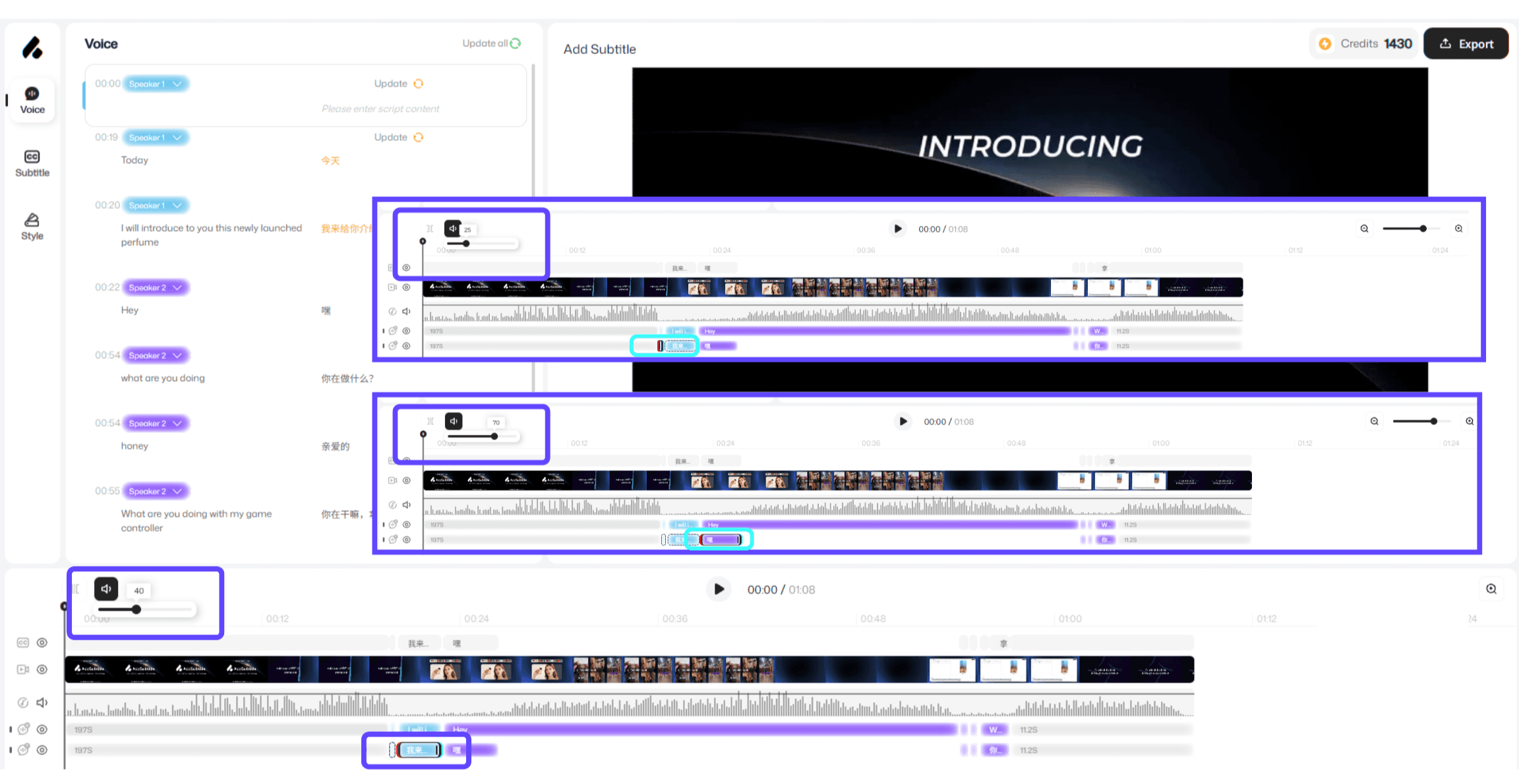 字幕の追加は、元のビデオ音声と吹き替えトラックの音量調整をサポートしています。元の音声は統一された音量設定を使用しており、複数のセグメントに分割された後でも、音量の変化はすべての元の音声セグメントに同期され続けます。しかし、吹き替えトラックは「吹き替えブロック」によって個別に管理されているため、異なる吹き替えブロックの音量を個別に調整することで、より精密なコントロールが可能です。