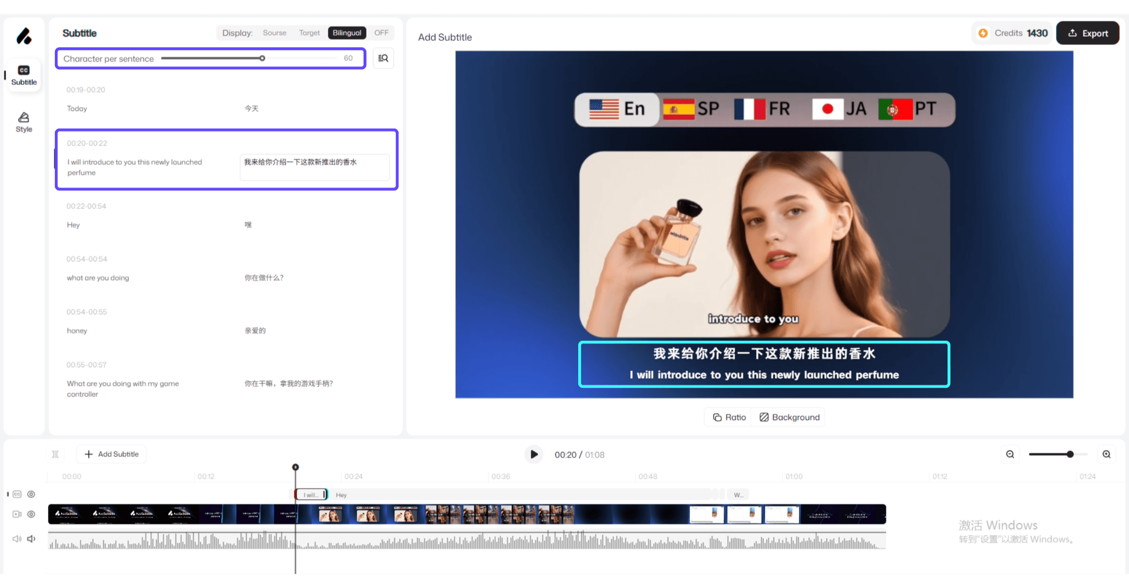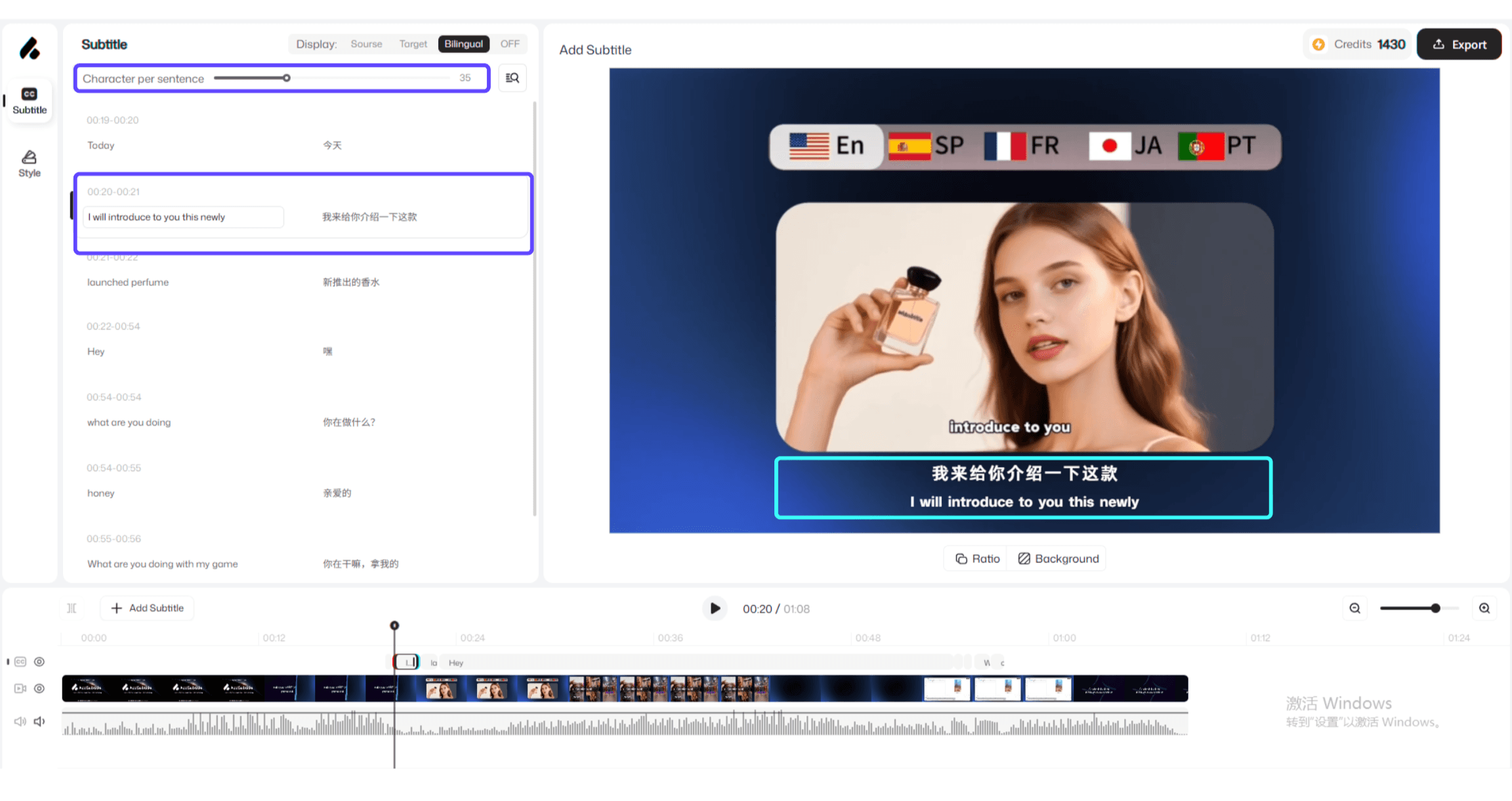 Ao usar IA para gerar automaticamente legendas, o sistema segmenta automaticamente as frases com base no significado.