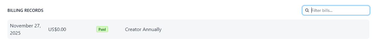 Na página de detalhes da assinatura, você pode visualizar todos os registros de assinaturas anteriores e localizar rapidamente uma fatura específica usando filtros de datas ou pesquisa.