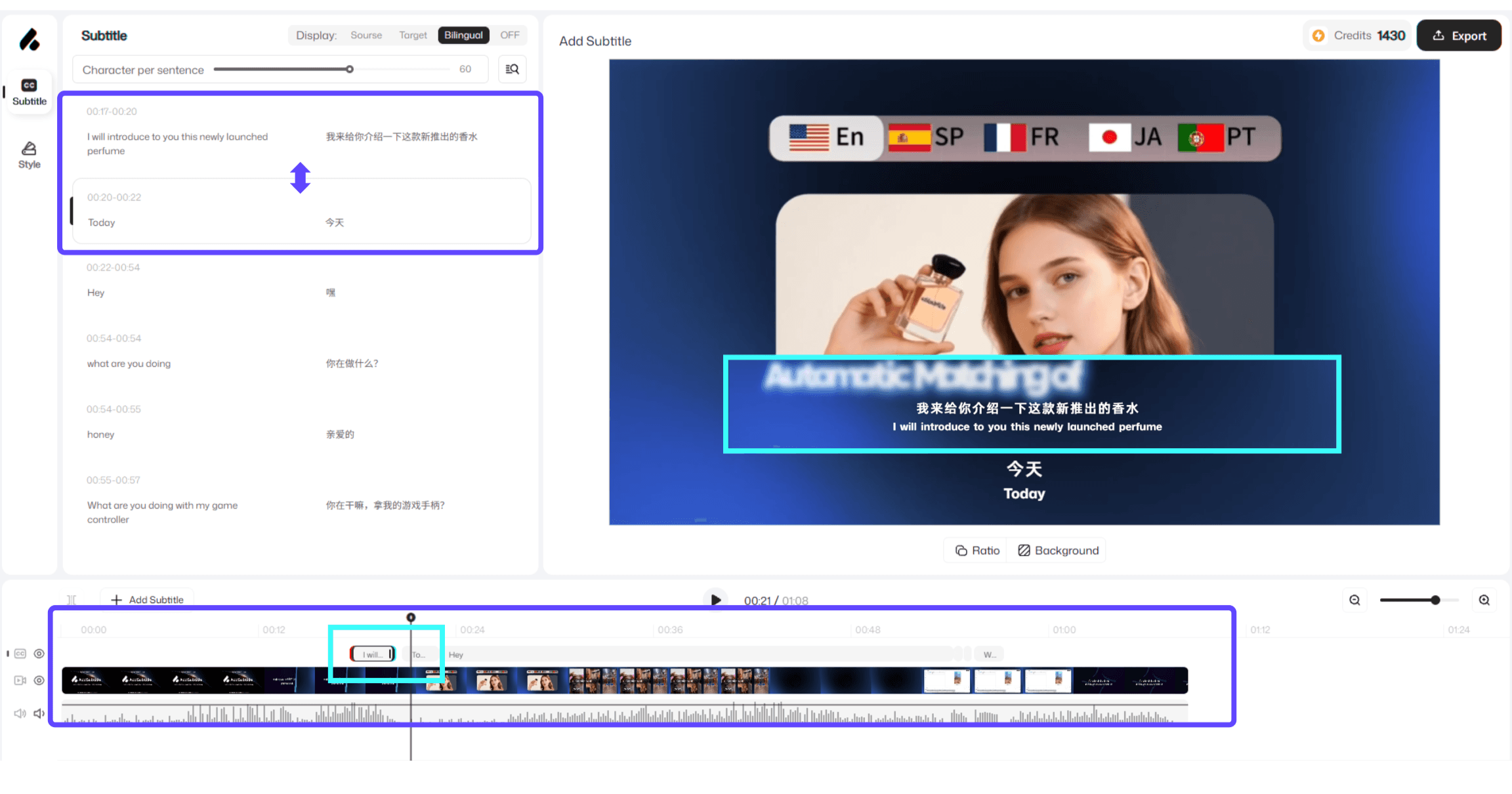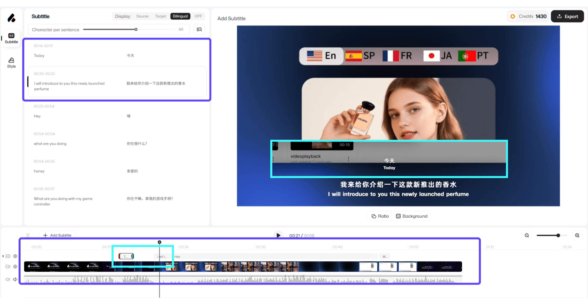 Ao arrastar「 Blocos de Legenda 」na linha do tempo, você pode ajustar rapidamente quando as legendas aparecem e alterar sua ordem de reprodução. Todas as alterações são sincronizadas com o「 Painel de Legendas 」em tempo real—facilitando a visualização do ritmo geral e revisão do seu conteúdo no AddSubtitle.